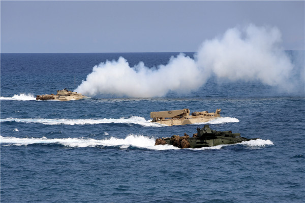US military forces on amphibious assault vehicles operate in the South China Sea near the shore of San Antonio, Zambales province, Philippines, during the annual Balikatan (shoulder-to-shoulder) war games with Philippine soldiers on April 21. [Photo/provided to China Daily]