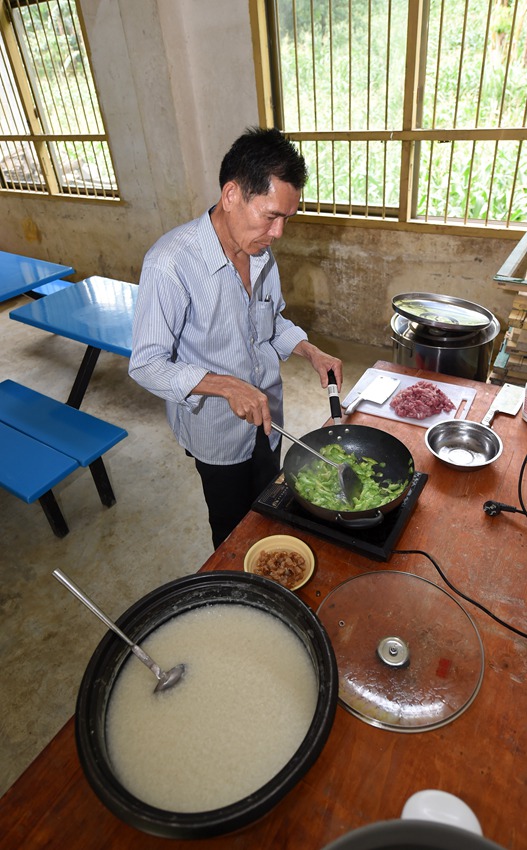 Liang Zhengwen cooks food for the pupils on June 16. (Photo/ Xinhua)