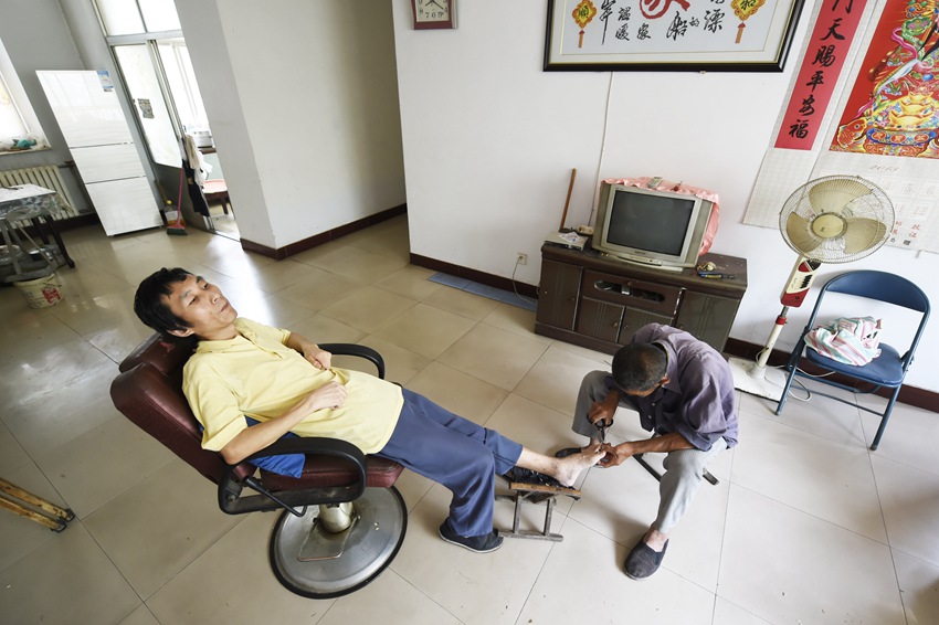 Zhou Baozhong helps his son to trim the nails on June 17. (Photo/Xinhua)