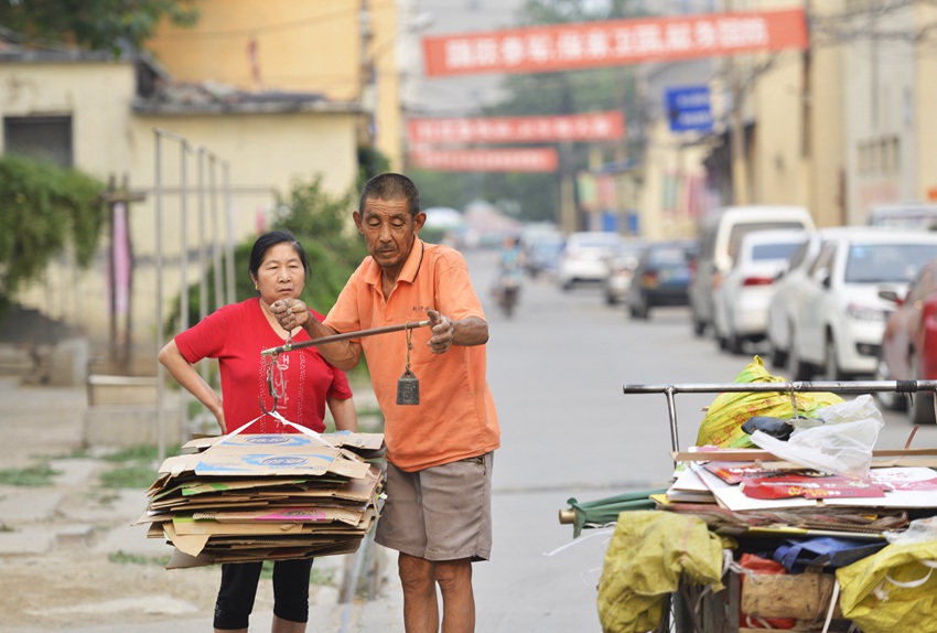 Zhou Baozhong collects scraps in a neighboring village on June 16. (Photo/Xinhua)