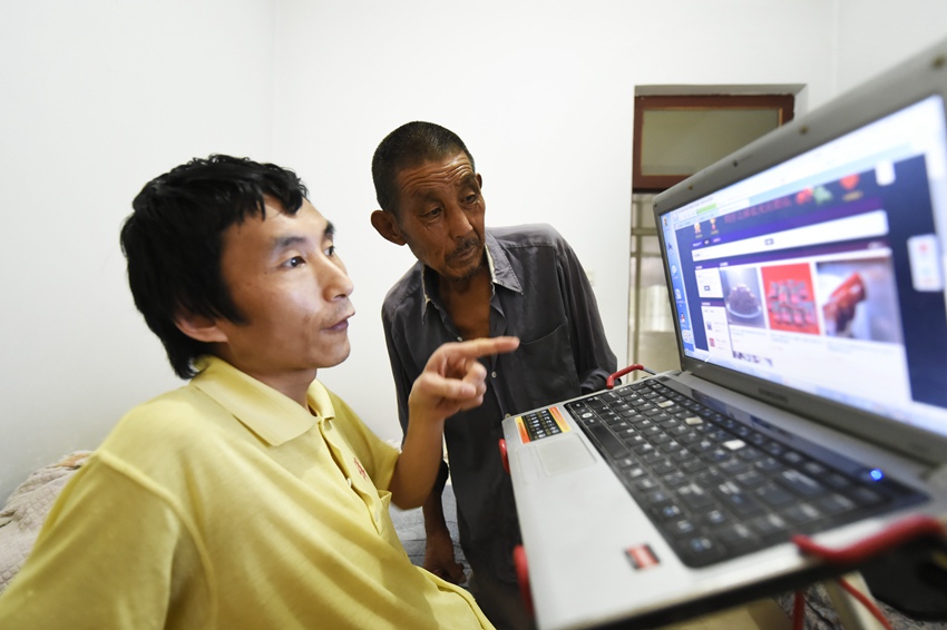 Zhou Yong (L) shows his online shop on Taobao.com to his father on June 16. (Photo/Xinhua)