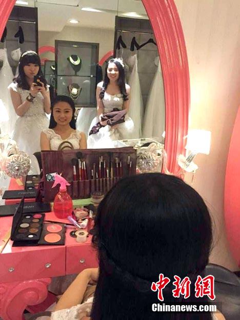 To memorize their school life, girls in Northeast Dianli University take a group of graduation photos in wedding dresses. (Chinanews.com/Feng Lu)