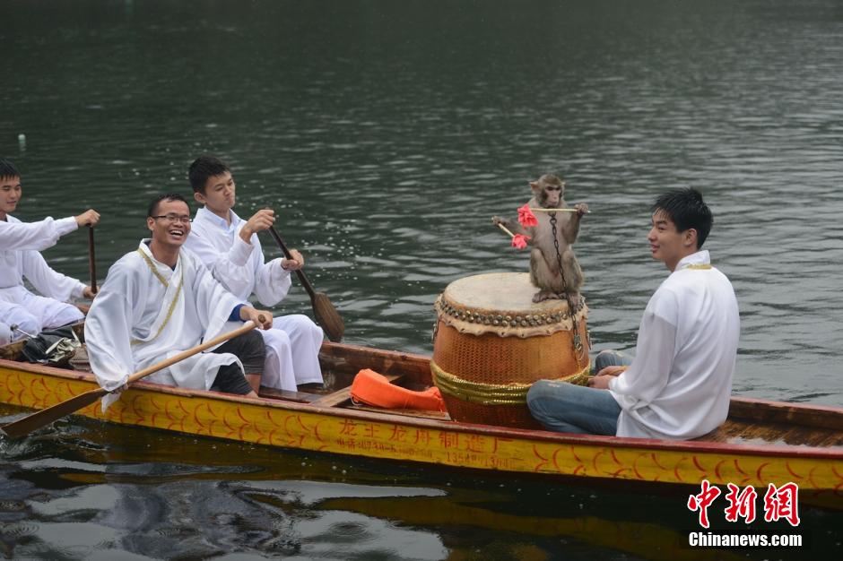 To celebrate the upcoming Dragon Boat Festival, a dragon boat race is held in Shiyanhu Park in Changsha, central China’s Hunan province on June 18, 2015. Two adorable monkeys acted as drummers in the boats, bringing much fun to the contest. (CNS/Yang Huafeng)