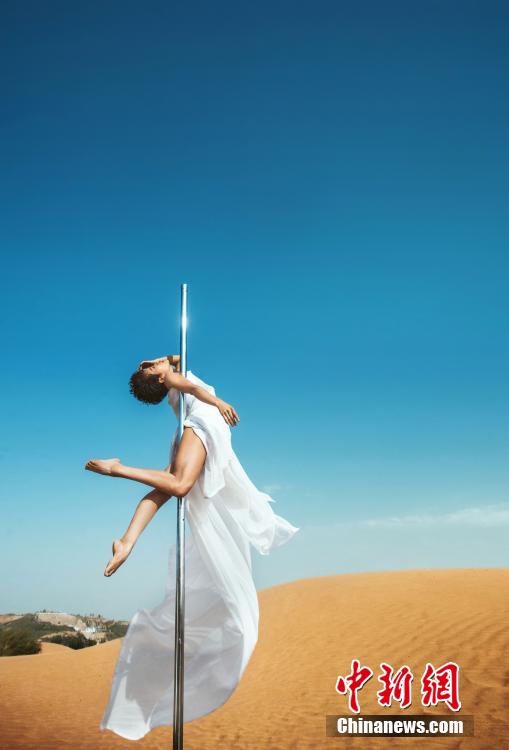 Fang Yi takes promotion photos for pole dancing in desert. (Chinanews.com/Yuan Biao)
