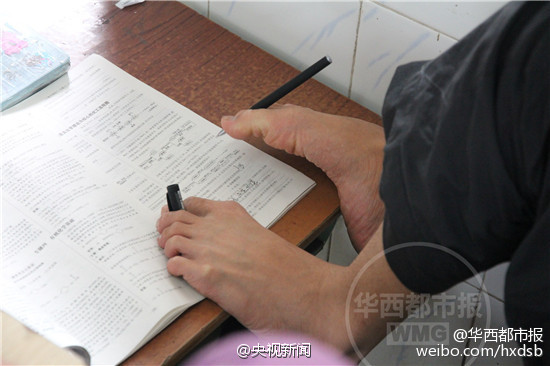 Peng Chao lost both arms at 6 in an accident, but he never yields to fate. He has overcome many unimaginable difficulties and learned to put on clothes, write, and use computer with feet. In the college entrance examination held in early June 2015, he held a pen with one foot and answered the questions on the paper. He scored 603 out of 750 in the examination and won an opportunity to get recruited by one of the top universities in China.(Photo/wccdaily)