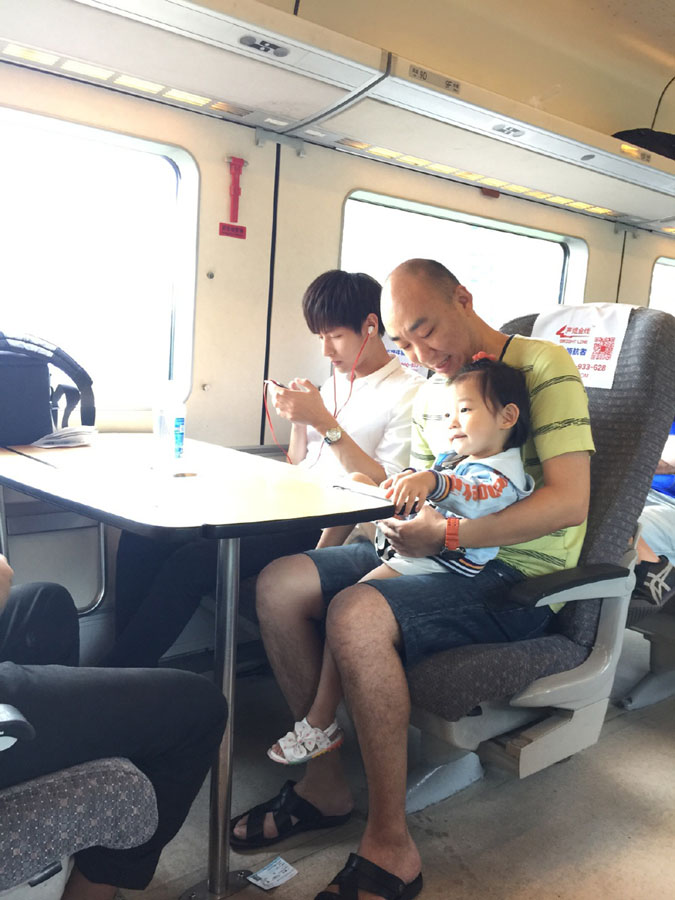 | A young man wearing earphones has gone viral online for taking care of a little girl recently. The photos show this man successfully stopped the little girl from crying by sharing one of his earphones with her. It is said that they were on a train from Guangzhou to Shenzhen on June 22. The young man's kindness and handsome looking won high praise from netizens. Many fans said they hope to see more selfies on his Weibo. (Yangtze evening news/Xu Jing) |