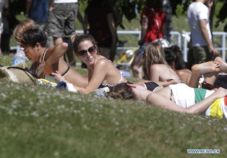 A resident enjoys sun tanning at a park in Vancouver, Canada, June 27, 2015. According to the weather forecast from Environment Canada, heat wave warning was issued in Vancouver with temperature expected to rise dramatically over the weekend with about 30 degree Celsius. The inland of British Columbia may hit at 40 degree. (Xinhua/Liang sen)