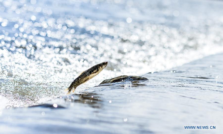 Adult migratory naked carps (Gymnocypris przewalskii), a kind of rare carps, are seen during the spawning season in the Shaliu river around Qinghai Lake, northwest China's Qinghai Province, June 23, 2015. (Xinhua/Wu Gang)