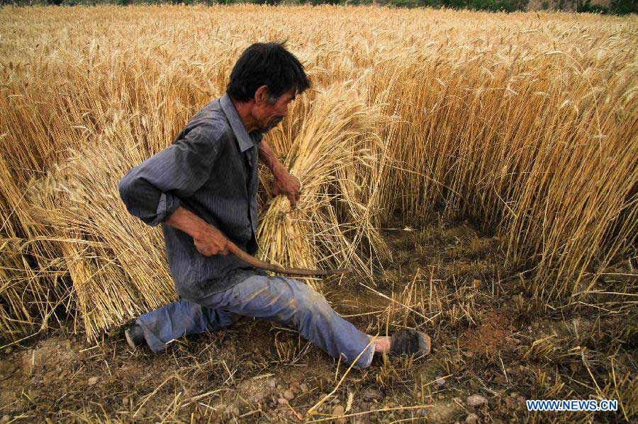 A farmer harvests wheat at Zhangyuan Village in Qingyang City, northwest China's Gansu Province, June 26, 2015. (Xinhua/Zhang Yongxin)