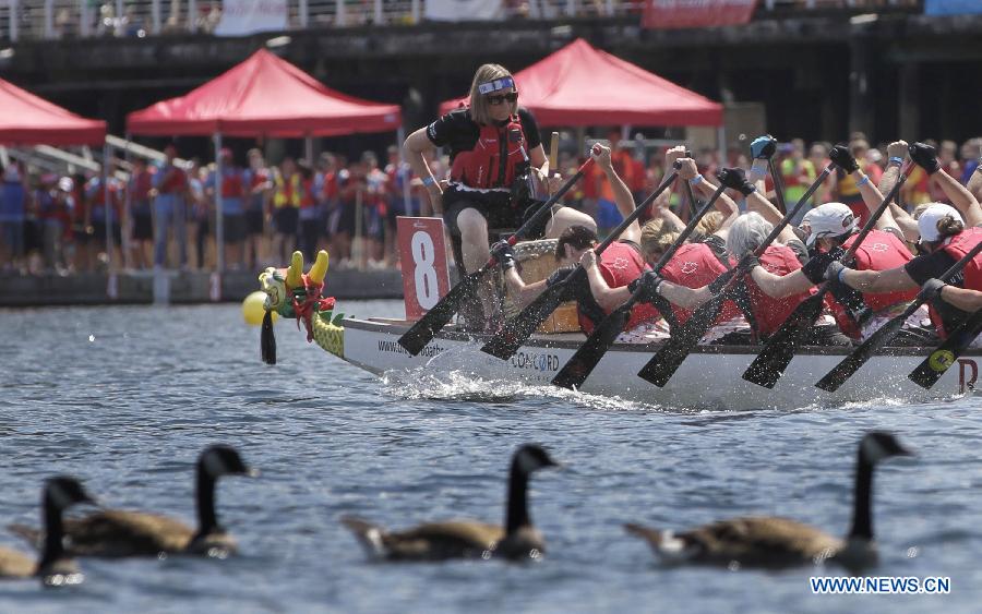 Paddlers compete on water during the dragon boat festival in Vancouver, Canada, June 20, 2015. Recognized as North America's biggest dragon boat festival, the Rio Tinto Alcan Dragon Boat Festival sees its 27th annual event from June 19 to 21. The festival attracted 188 teams with more than 5,000 paddlers competing on water and more than 100,000 spectators. (Xinhua/Liang sen)