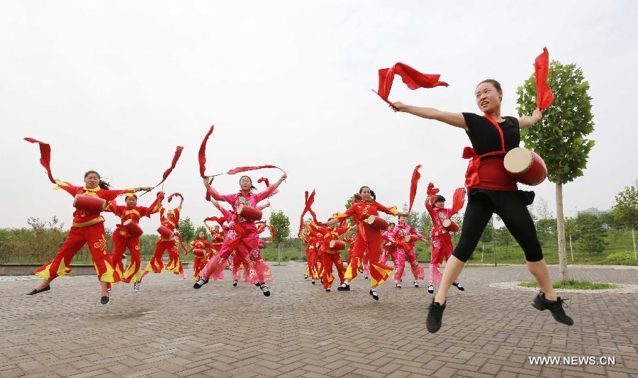 Villagers practice drum dance at the guidance of a professional choreographer at Dongzhongxu Village of Wuzhi County, central China's Henan Province, June 28, 2015. (Xinhua/Feng Xiaomin)