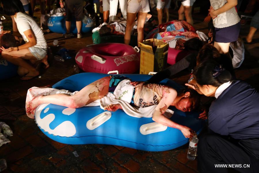 People injured in a fire are attended at a park in New Taipei, southeast China's Taiwan, June 27, 2015. A fire, which was suspected of resulting from explosion of a large amount of unknown flammable powder, in a recreational park in Taiwan's New Taipei city on Saturday has injured at least 474 people. (Xinhua)