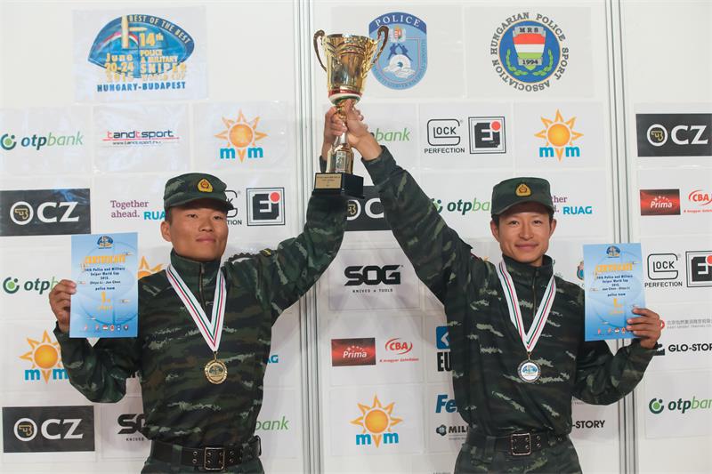 Chen Jun (left) and Li Zhiyu (right) hold up the trophies after winning the police team category on June 23, 2015.
