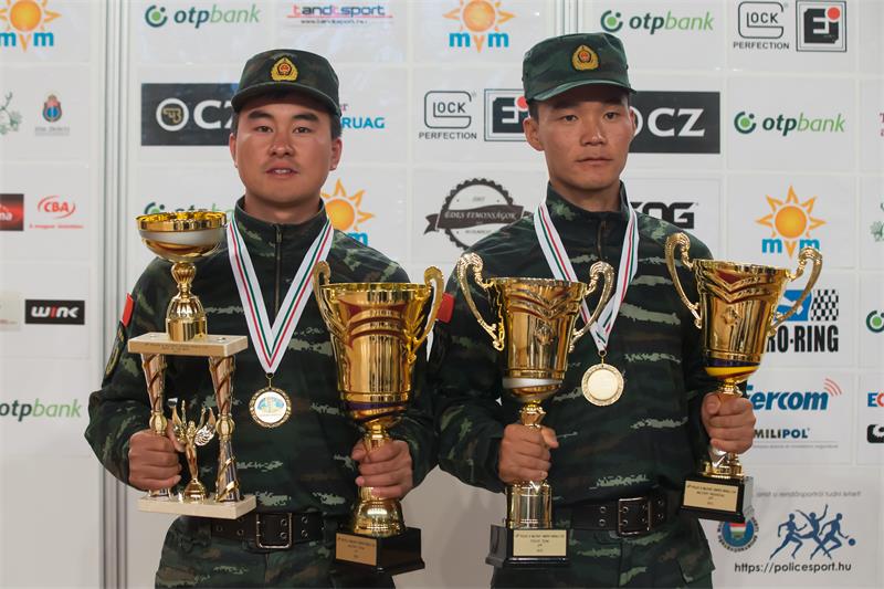 | Wang Yongchuan and Li Wen (right) win a special award for having scored the highest marks among all the participating teams. They also won the military team category. The photo shows they lifting their trophies on June 23, 2015. |