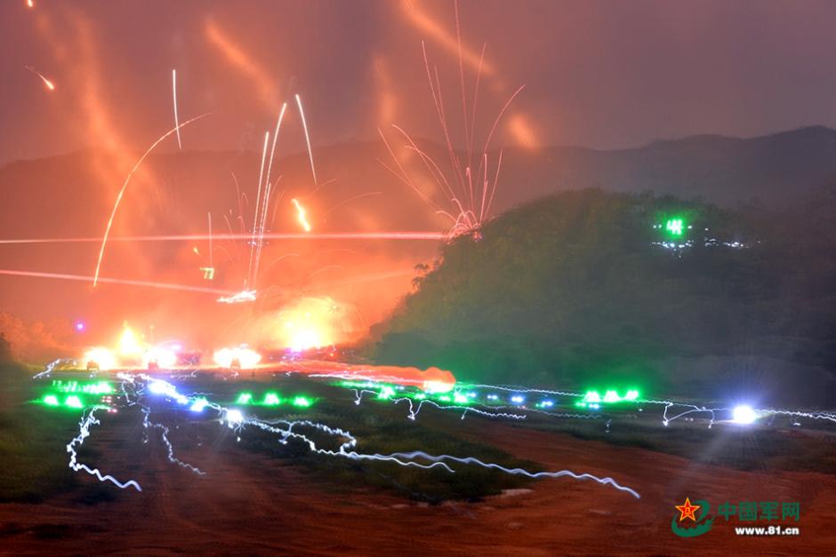 Recently, PLA soldiers from the 42nd Group Army, Guangzhou Military Region, Hainan Provincial Military District, PLA Hong Kong Garrison and PLA Macao Garrison conduct a drill at night in eastern Guangdong. (Photo/81.cn)