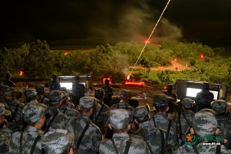 Recently, PLA soldiers from the 42nd Group Army, Guangzhou Military Region, Hainan Provincial Military District, PLA Hong Kong Garrison and PLA Macao Garrison conduct a drill at night in eastern Guangdong. (Photo/81.cn)