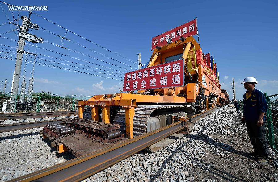 A track-laying vehicle lays the last section of steel rail on the western ring of the high-speed rail loop line in south China's Hainan Province, June 30, 2015. The project of high-speed rail loop line in Hainan was officially completed as its western ring and eastern ring were connected as a closed loop on Tuesday. The travelling time between all cities and counties in Hainan will be within three hours once the loop line is opened to traffic. (Xinhua/Guo Cheng)