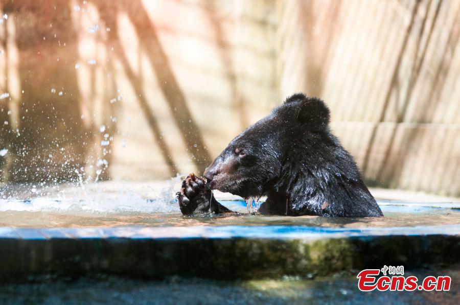 A black bear enjoys cool water at a zoo in Liuzhou city, Southwest China’s Guangxi Zhuang autonomous region, June 30, 2015. The zoo has tried different ways to help animals feel cool as the city suffered lingering heat waves. Temperature rose to 36 degrees Celsius on Tuesday. (Photo: China News Service/Huang Weiming)