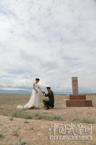 At the border between China and Kazakhstan, Mulati, an ethnic Kazakh police officer at the Dulata border inspection station, has a romantic wedding with his bride Senbati, who is also ethnic Kazakh, on May 28, 2015. (Photo/wj.81.cn)