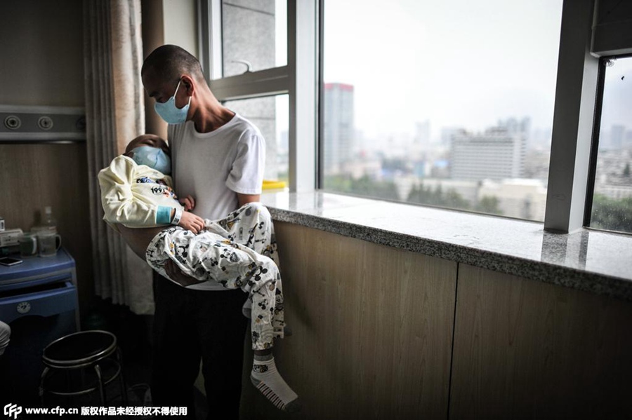 Eleven Chinese fathers who have their heads shaved set up a bald father supporting group for those children with leukemia in China. (Photo/ CFP)