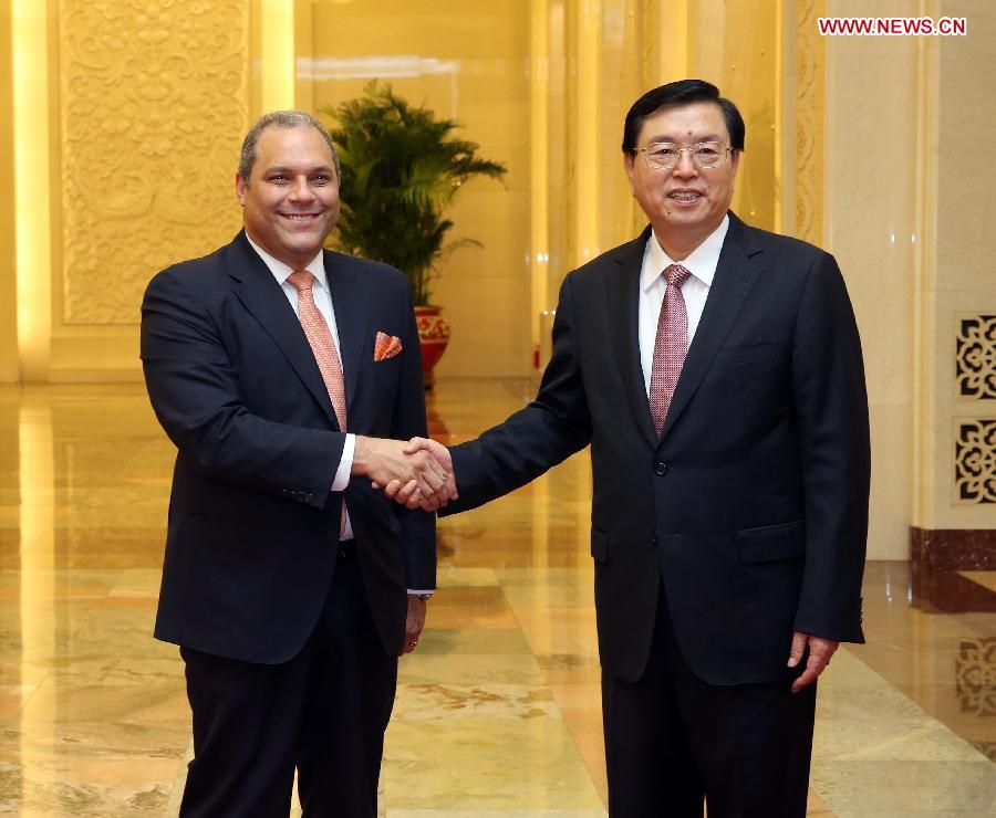 Zhang, chairman of the Standing Committee of the National People's Congress (NPC), reviewed Chinese President Xi Jinping's meeting with Colombian president last July and Premier Li Keqiang's visit in May, saying the events witnessed consensus and agreements on promoting China-Colombia relations.
