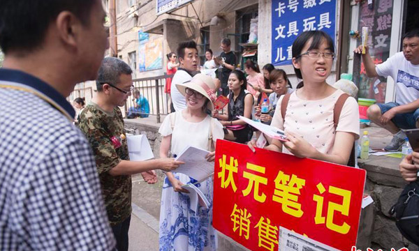 On June 28, six students who had been admitted to Tsinghua University and the University of Hong Kong sold their notes outside a venue for the high school entrance exam. Parents of those students who will enter high schools rushed to buy the notes.