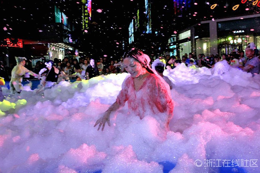 Participants to a night foam party revel in colorful bubbles in front of a shopping mall in the walking street in Jinhua, east China's Zhejiang province on July 1, 2015. (Photo/ zjol.com.cn)