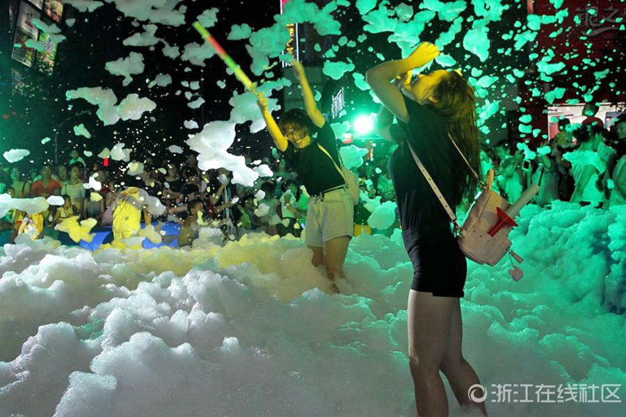 Participants to a night foam party revel in colorful bubbles in front of a shopping mall in the walking street in Jinhua, east China's Zhejiang province on July 1, 2015. (Photo/ zjol.com.cn)