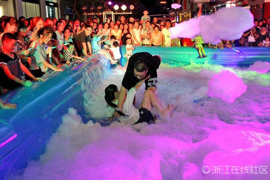 Participants to a night foam party revel in colorful bubbles in front of a shopping mall in the walking street in Jinhua, east China's Zhejiang province on July 1, 2015. (Photo/ zjol.com.cn)