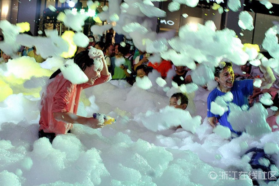 Participants to a night foam party revel in colorful bubbles in front of a shopping mall in the walking street in Jinhua, east China's Zhejiang province on July 1, 2015. (Photo/ zjol.com.cn)