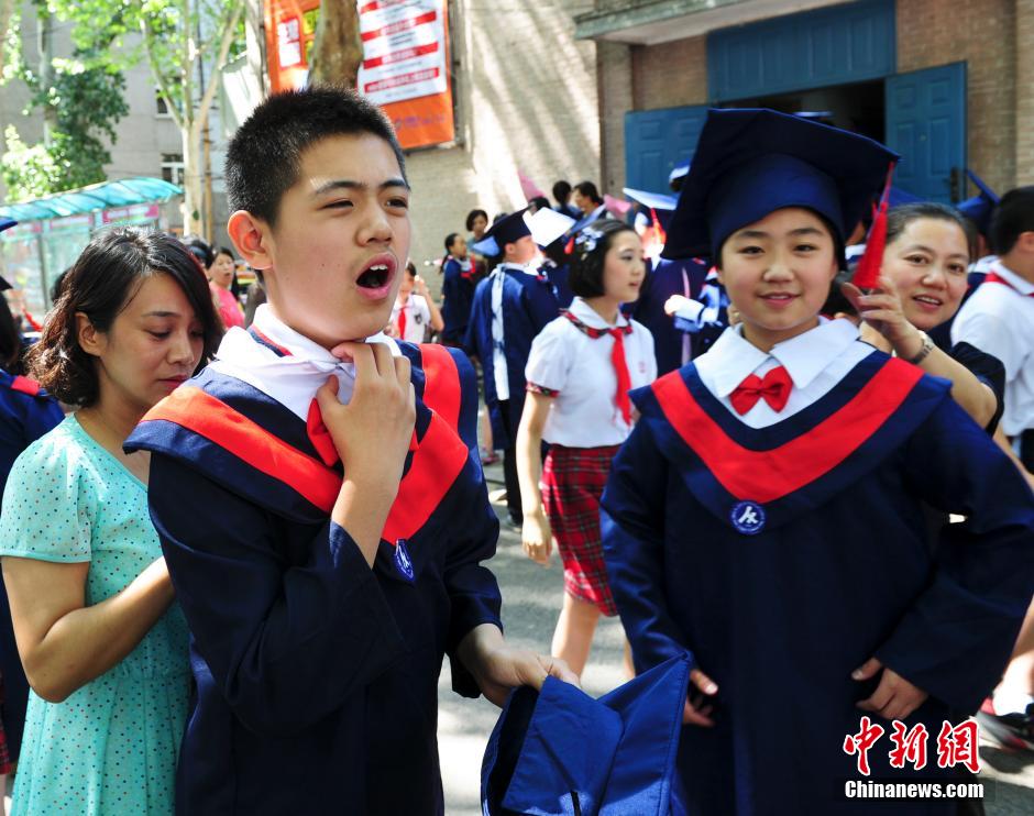 Pupils in “academic dresses” attend the graduation ceremony and salute to their teachers in the Primary School Affiliated to Shandong Normal University in Jinan on July 2, 2015. Nearly 500 graduates accepted graduation certificates from the headmaster. (Chinanews.com/Zhang Yong)