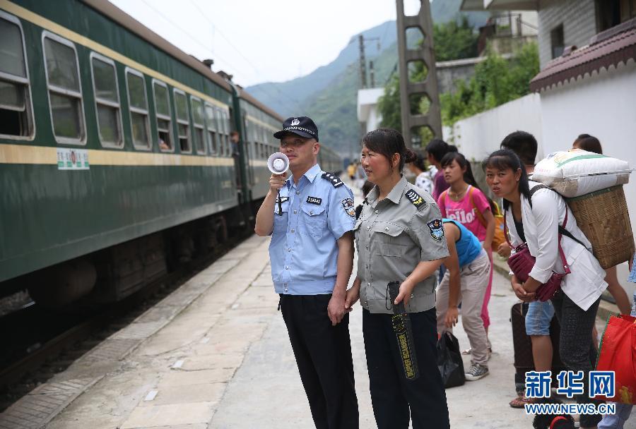 Pan Yong, the blind policeman of Lanba police station, gives a speech on security beside the railway with his wife. (Xinhua/Wang Shen)