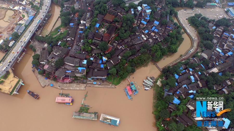 Due to the heavy rainfall in Sichuan, the Yangtze River and Jialing River in Chongqing see the worst flooding process, in which the water level rose up to 7 to 10 meters. Aerial photos of the riverside areas of Chongqing’s main districts after the flood peak transit were taken by drones. (Photo/Xinhua)