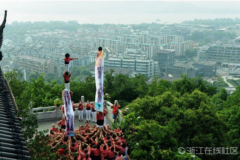 A total of 190 performers from Spain build human towers - 'Castells', a Catalan tradition originating in the 18th century, on July 2, 2015 in Hangzhou, east China. (Photo/ zjol.com.cn)