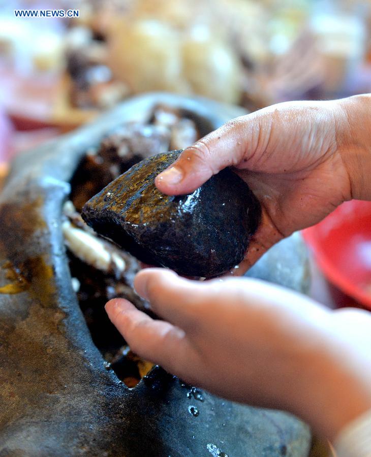 A stone-made roast lamb is seen during a traditional Sonid meat fair in Sonid Left Banner, north China's Inner Mongolia Autonomous Region, July 5, 2015. (Xinhua/Ren Junchuan)