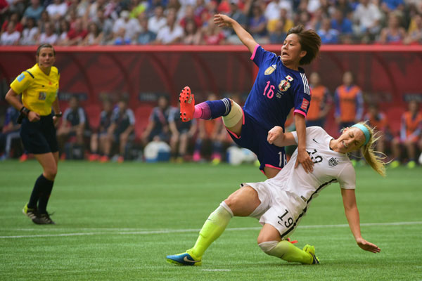 | United States defender Julie Johnston (19) and Japan forward Mana Iwabuchi (16) get tangled up in the second half of the final of the FIFA 2015 Women's World Cup at BC Place Stadium. [Photo/Agencies] |