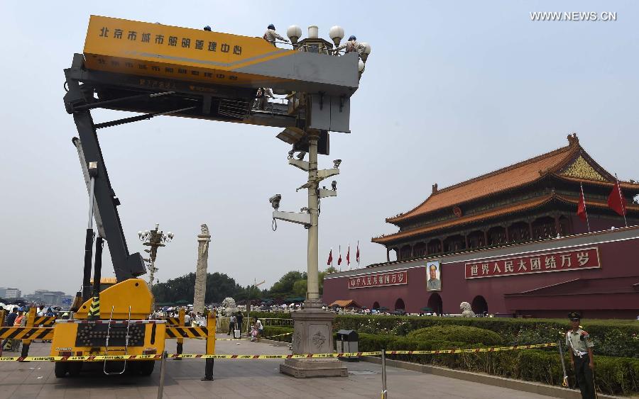Workers clean and overhaul a lamp during the annual maintenance of city lamps near Tian'anmen Square, in Beijing, capital of China, July 6, 2015. (Xinhua/Gong Lei)