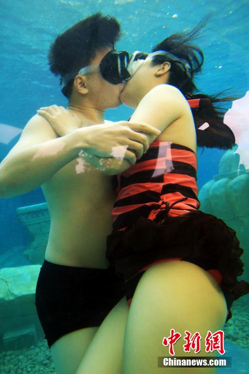 Lovers dive to push the limit of kissing. (Chinanews.com/Pan Suofei)