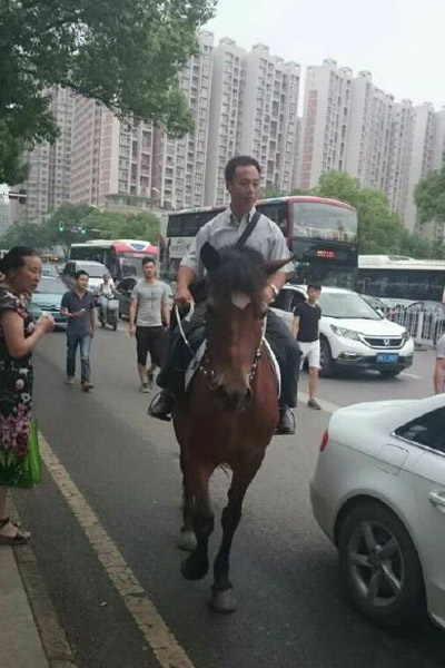 A man rides a horse to work in Wuhan, capital city of central China's Hubei province, July 6, 2015. The man is a member of an equestrian club in Wuhan. He said that he was often late for work due to the traffic jam. Therefore, he gives up the car and chooses to ride a horse instead.
