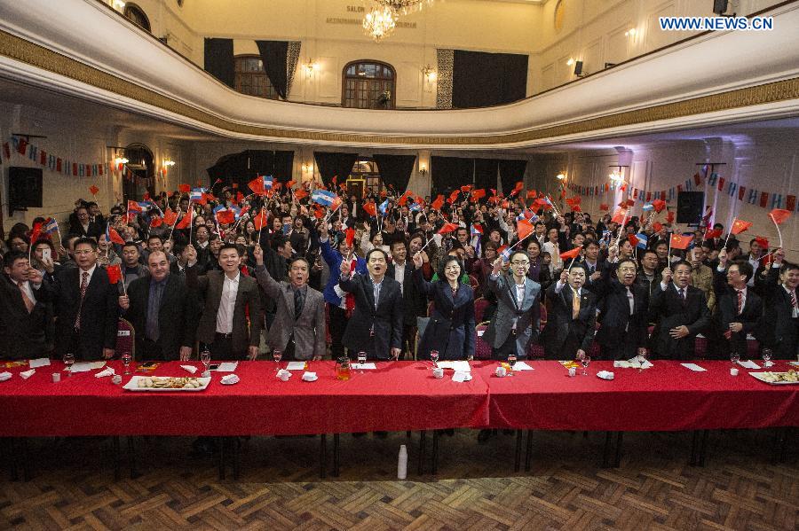 Chinese Ambassador to Argentina Yang Wanming (6th L, front) attends the commemoration in Buenos Aires city, Argentina, July 6, 2015. Overseas Chinese in Argentina on Monday celebrated the 70th anniversary of the victory in the Chinese People's War of Resistance against Japanese Aggression and the victory of World's Anti-Fascist War. (Xinhua/Martin Zabala)