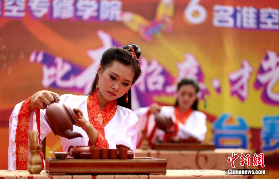 6 students majoring flight attendance holds a talent competition on campus to find their true love in southwest China's Chengdu on July 6, 2014. The six girls competed talents such as art martial, tea ceremony with the challengers. "We hold the competition to meet more friends, and to find a soul mate," said one of them. (Photo/Liu Zhongjun)