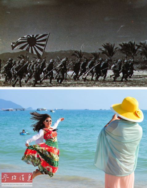 Above: Japanese army lands on the Hainan Island in February 1939. Below: Tourists take photos by the sea in Sanya, Hainan. (Imposition photo) (Xinhua/Hou Jiansen)
