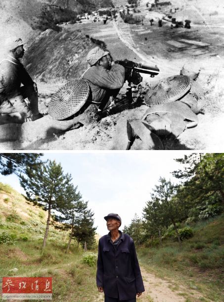 Above: The soldiers of 115th Division of the Eighth Route Army ambush Japanese army in Pingxing Pass. (File photo, taken in 1937) Below: Li Caishi, an 83-year-old villager of Xiaozhai, Lingqiu county walks in the main battlefield of the Battle of Pingxing Pass on June 2, 2015. (Imposition photo) (Xinhua/Chen Yehua)