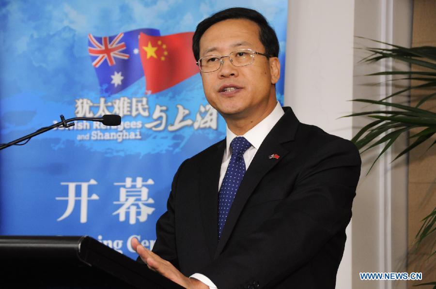 | Chinese Ambassador to Australia Ma Zhaoxu addresses the opening ceremony of the exhibition "Jewish Refugees and Shanghai" in Canberra, Australia, July 7, 2015. The exhibition was held here on Tuesday to commemorate the 70 anniversary of the end of WWII. (Xinhua/Zhao Bo) |