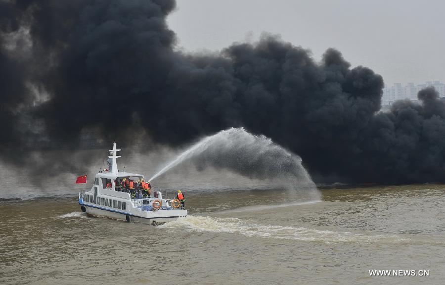 A water rescue drill is held on the Ganjiang River in Nanchang, capital of east China's Jiangxi Province, July 8, 2015. Some 300 people and 33 vessels as well as drones and rescue vehicles were involved in the drill here on Wednesday. (Xinhua/Zhou Mi)