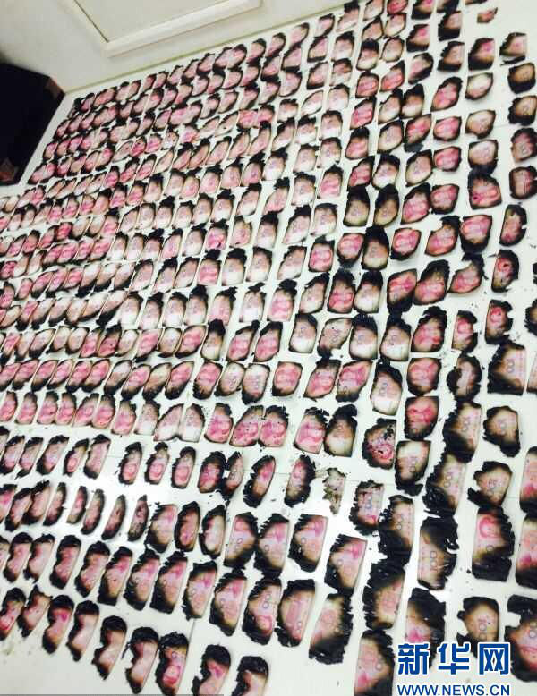 | A villager’s cash worth 80,000 yuan was burned in a fire in his house in Lutong, east China’s Zhejiang province. Fortunately she retrieved part of the burnt banknotes. The owner took the remains of the banknotes to Tonglu branch of Bank of China which examined the remains and paid back 55,600 yuan to the owner. (Photo/Xinhua) |