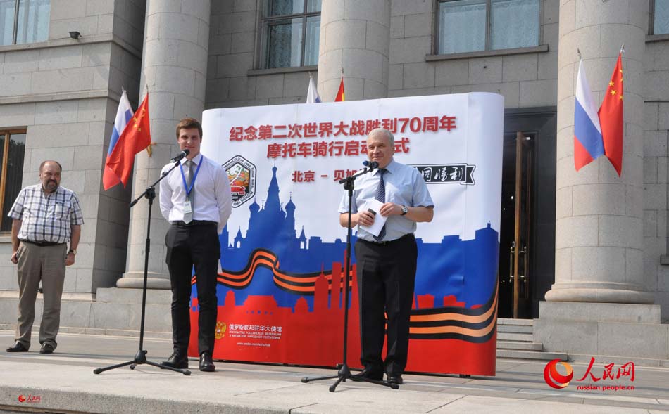 To mark the 70th anniversary of the victory of WWII, a group consisting of 40 Chinese and Russian, 23 motorcycles and 5 cars left Beijing for Baikal in Russia. It will take the riders 18 days to complete the 3,500-kilometer journey. (People's Daily Online/Li Yan)