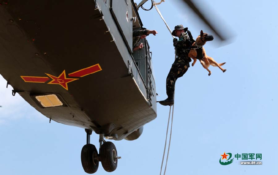 A military dog jumps from a helicopter with a soldier. (Photo/81.cn)