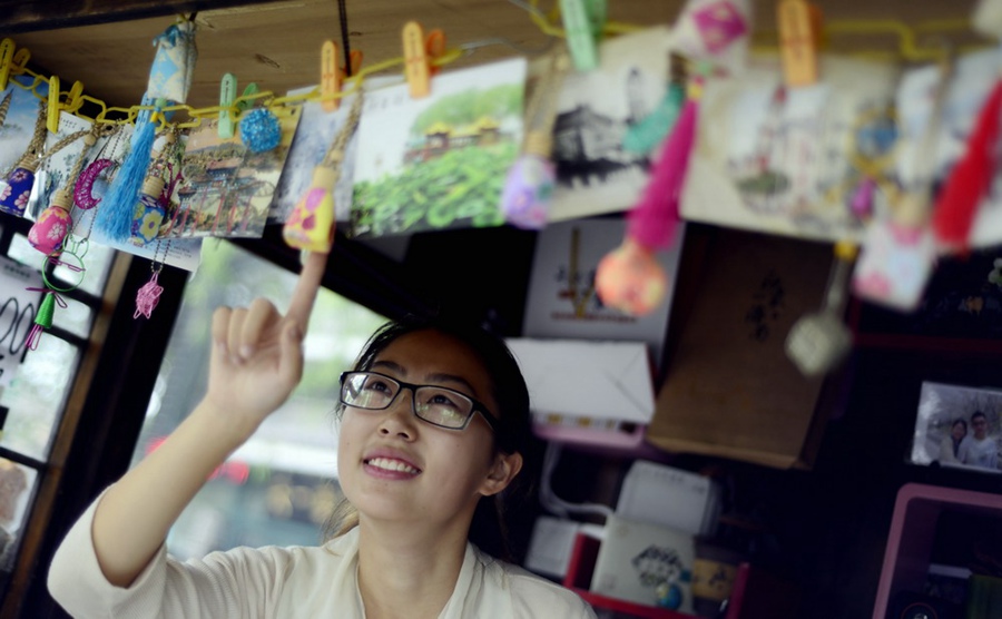 Yang Fan, 21, is a sophomore. In April, she rented a booth in the Jinan folk culture street to sell postcards with Jinan features. To make it more convenient for the customers, Yang sets up a mailbox beside her booth with the support of the post office. Every day at 4 p.m., she would deliver these postcards to the Post Office herself.
