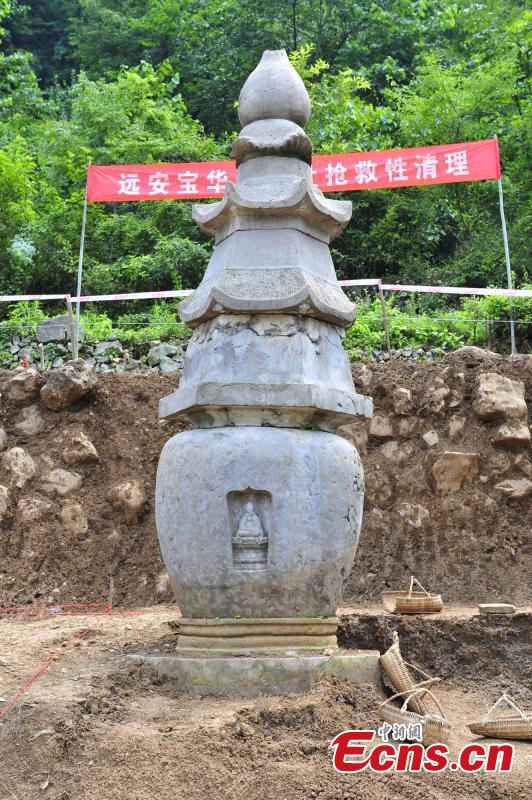A relic of the Ming Dynasty (1368-1644) is found at a village in Yuan’an county, Central China’s Hubei province, July 10, 2015. A stone tortoise was found first when construction work was taking place, and archeological workers later discovered a Buddhist pagoda. (Photo: China News Service/Wang Kangming)